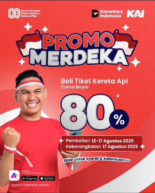 Uritanet – Jakarta 12 Agustus 2025 – Penumpang kereta api punya kesempatan emas merayakan Hari Kemerdekaan dengan lebih hemat. PT Kereta Api Indonesia (Persero) Daerah Operasi 1 Jakarta (Daop 1) membuka Promo Merdeka yang memungkinkan pelanggan membayar hanya 80 persen dari harga normal untuk keberangkatan khusus 17 Agustus 2025.