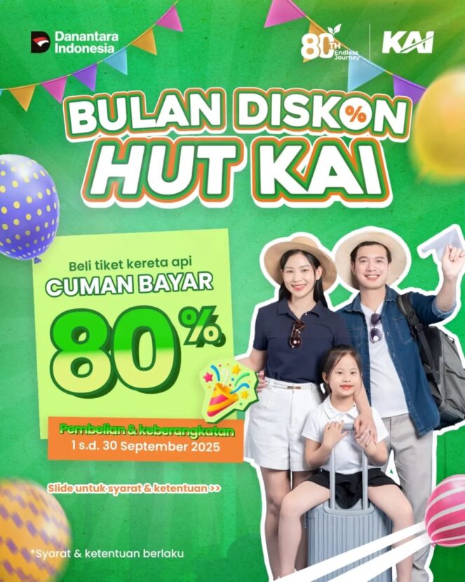 Uritanet – Jakarta, 3 September 2025 Memasuki usia ke-80 pada 28 September mendatang, PT Kereta Api Indonesia (Persero) menegaskan komitmennya sebagai penyedia transportasi publik yang aman, nyaman, dan terjangkau. Salah satu bentuk apresiasi yang dihadirkan perusahaan adalah promo diskon tarif 20 persen yang berlaku sepanjang September 2025.