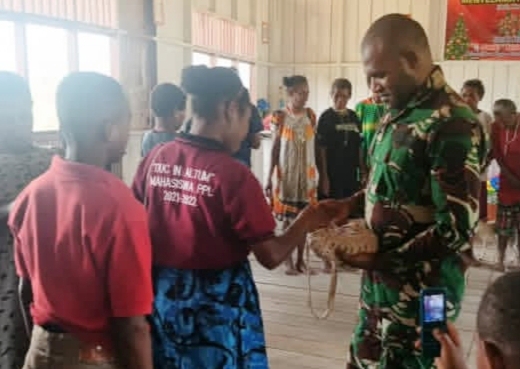 Pos Tarup Satgas Swasembada Yonif 751/Vira Jaya Sakti (VJS) melaksanakan ibadah bersama jemaat di Gereja Katolik Kristus Bangkit, Distrik Tarup, Kabupaten Pegunungan Bintang. Kegiatan ini menjadi bentuk pembinaan teritorial humanis sekaligus mempererat hubungan dengan masyarakat setempat.